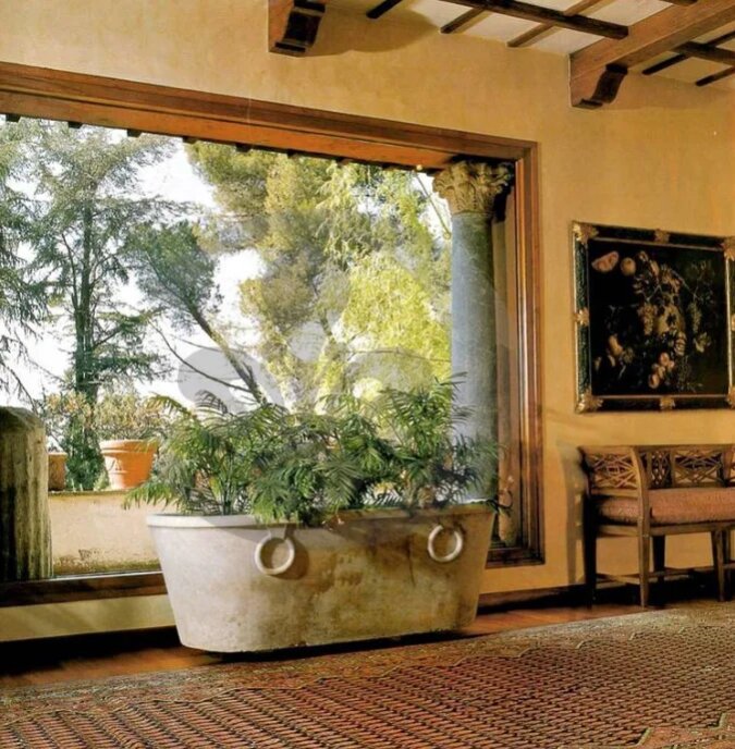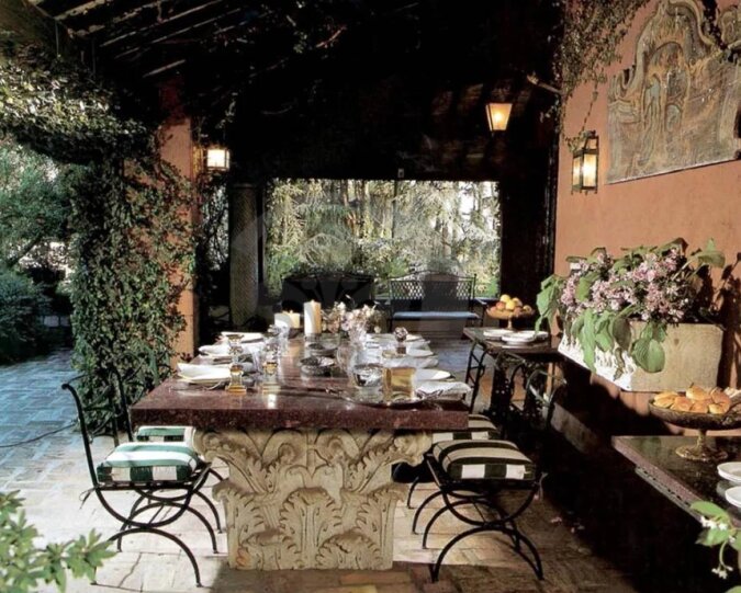 Kwiaty rosną w antycznej wannie. Również w sarkofagu są posadzone kwiaty. Obok stołu jadalnego znajduje się kolejny stół, którego blat jest również wykonany z porfiru.