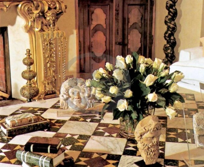 Na stole znajdują się kwiaty... Stół, którego blat wykonany z antycznego marmuru, kamieni porfirowych. W jednym ze sklepów z antykami w Rzymie są sprzedawane podobne stoły. Cena najmniejszego stołu – to około 15 000 euro.
