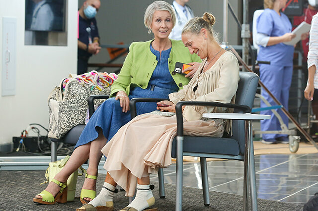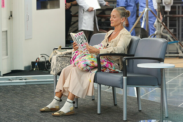 Aktorki rozmawiały o czymś, siedząc na ławce. Uśmiechały się i wyglądały na zrelaksowane. Bohaterka Parker, Carrie Bradshaw, zrezygnowała nawet ze swoich ulubionych butów Manolo Blahnik i zdecydowała się na klapki i skarpetki.