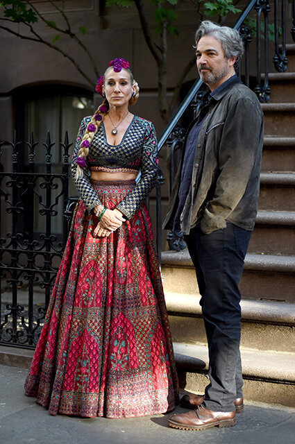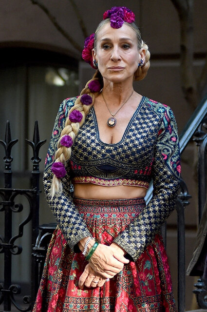 W innej scenie Parker pokazała inny oryginalny strój. Miała na sobie przycięty szary top i puszystą wielokolorową spódnicę Alexandra McQueena. Jej włosy były ozdobione jasnoróżowymi i liliowymi kwiatami.