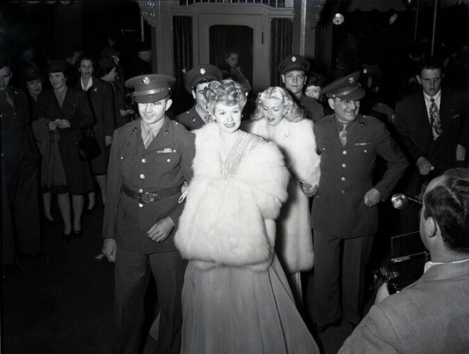 Aktorka w towarzystwie żołnierza przechadza się po czerwonym dywanie podczas premiery Show Business w 1944 roku.