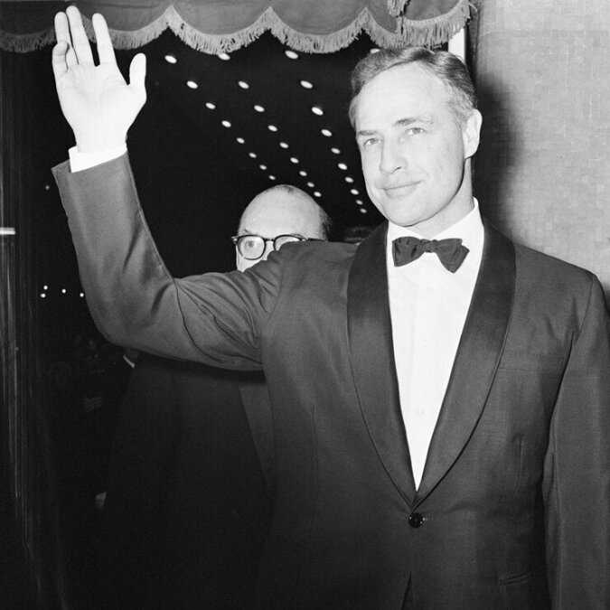 Aktor wita fotografów na premierze Hrabiny z Hongkongu w 1967 roku.