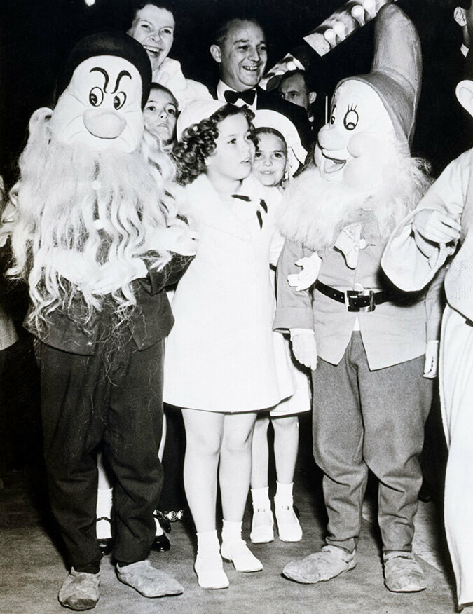 Dziewczynka, która zostanie słynną aktorką pozuje z krasnoludkami na premierze Królewny Śnieżki i siedmiu krasnoludków w Los Angeles – 23 grudnia 1937 roku.