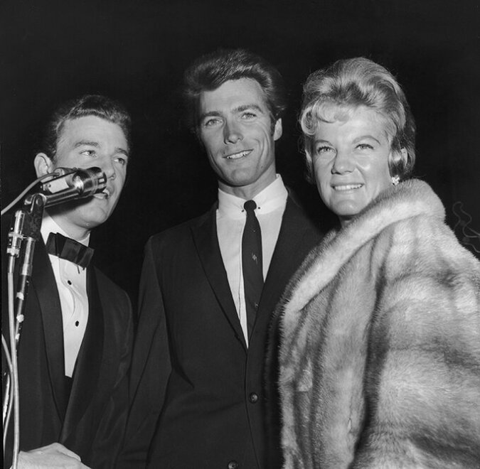 Aktor pozuje do kamery ze swoją pierwszą żoną Maggie podczas premiery filmu Śniadanie u Tiffany'ego na Zachodnim Wybrzeżu Stanów Zjednoczonych w 1961 roku.