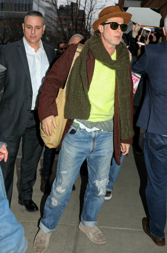 Najnowsza stylizacja Pitta – w neonowym swetrze – jest wyjątkiem w jego preferencjach kolorystycznych. Jednak i to mu odpowiada.
