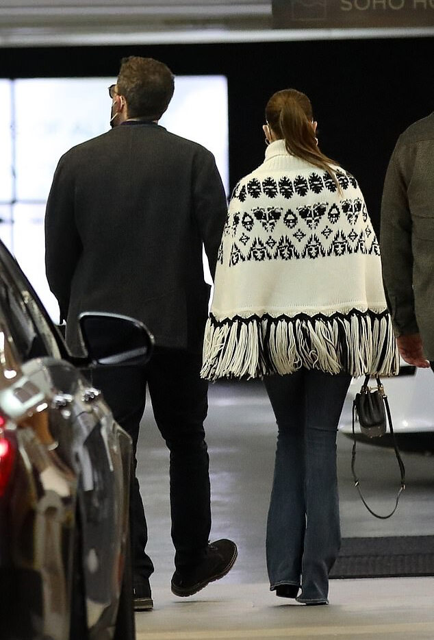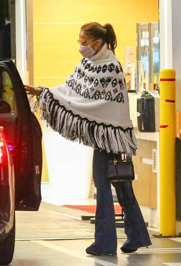Na wspólne wyjście Jen wybrała najbardziej wygodny i praktyczny look: czarno-białe ponczo z dzianiny i niebieskie dżinsy z rozszerzanymi nogawkami, które skutecznie podkreślały smukłe nogi gwiazdy, wizualnie je wydłużając.