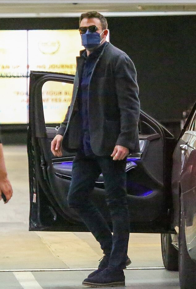 Ben wybrał klasyczną granatową koszulę w kratę, dżinsy i czarną marynarkę.