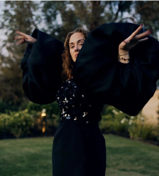 Gwiazda pokazała swoją figurę w czarnej mini sukience z ogromnymi bufiastymi rękawami. Gorset, ozdobiony dużymi cekinami, sugerował świąteczność stroju. Piosenkarka dodała kilka delikatnych bransoletek, które założyła na nadgarstek. Wykonawczyni hitu Rolling In the Deep pokazała zdjęcia, na którym wyglądała na całkowicie szczęśliwą.