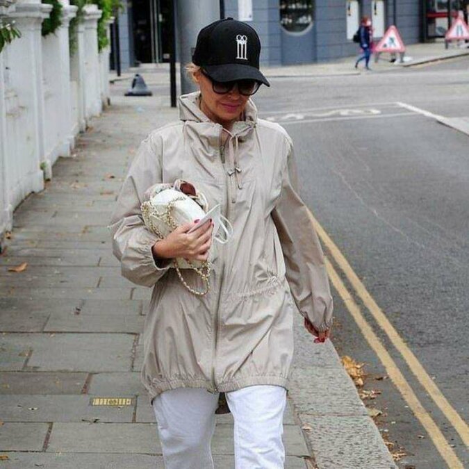Kylie wybrała białe spodnie i beżowy trencz. Piosenkarka uzupełniła swój stylowy wygląd białą torebką na łańcuszku, czapką z daszkiem i dużymi okularami przeciwsłonecznymi.