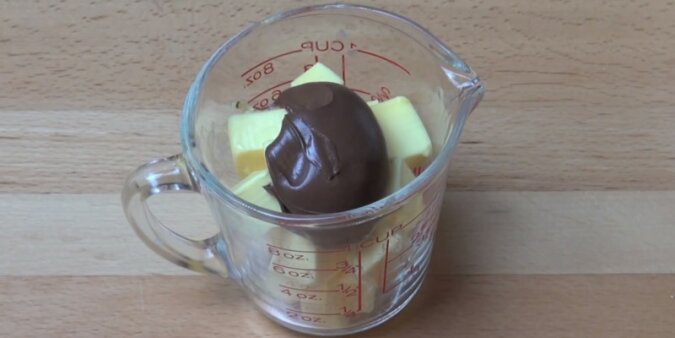 1. Wymieszaj masło z łyżką „Nutelli”. Połóż masę do kuchenki mikrofalowej. Masa powinna być dobrze stopiona.