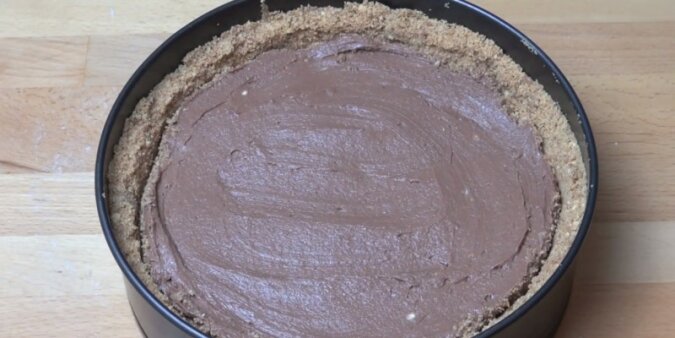 5. Połóż masę serową i „Nutelli” na masę z herbatników. Ostrożnie rozwałkuj masę na wierzchu. Odłóż na kilka minut i odczekaj: ciasto musi tak pozostać przez pewien czas.