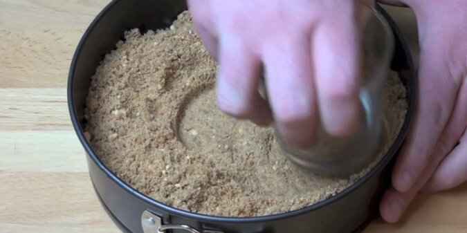 4. Wyjmij z lodówki masę z herbatników. Wyrównaj ją dobrze za pomocą szklanki. Ważne jest również to, aby wybrać odpowiednie naczynie dla przygotowania owego ciasta. Musi wyglądać świetnie.
