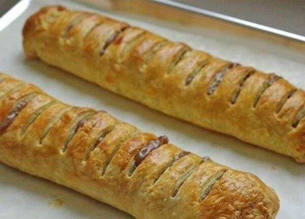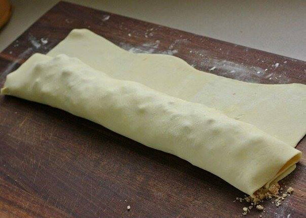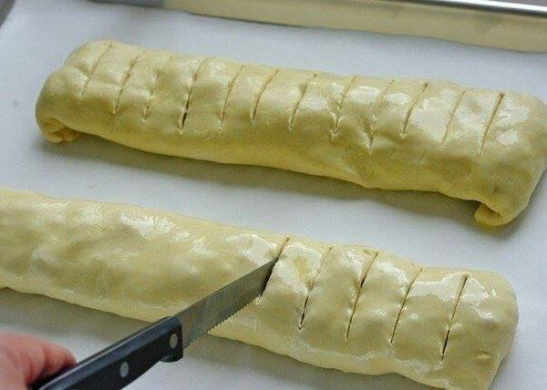 4. Następnie zgnij krawędzi rolki. Dalej połóż rolki na blasze do pieczenia, uprzednio przykrywając go papierem. Pomaruj jajkiem, które uprzednio zostało ubite razem z wodą. Wykonuj nacięcia wzdłużne na każdej rolce.