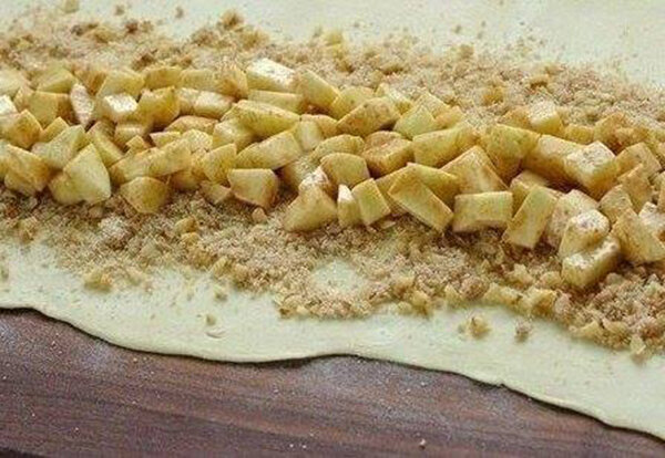 3. W osobnym pojemniku wymieszaj orzechy, dwa rodzaje cukru, a także krakersy. Rozwałkuj jeden arkusz ciasta francuskiego, posyp go mieszanką orzechów i połóż jabłko na wierzchu. Zamknij nadzienie, owijając krawędzi ciasta. Powtórz to samo z drugim arkuszem ciasta francuskiego, a także nadzieniem, które pozostało.