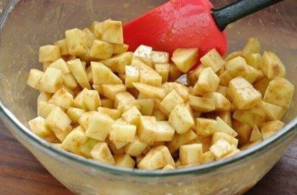 2. Obierz jabłka, usuń rdzeń i pokrój je. Następnie włóż jabłka do miski i wymieszaj z cynamonem, brązowym oraz zwykłym cukrem, a także mąką. Pozostaw jabłka na 20 minut, aż jabłka puszczą sok.