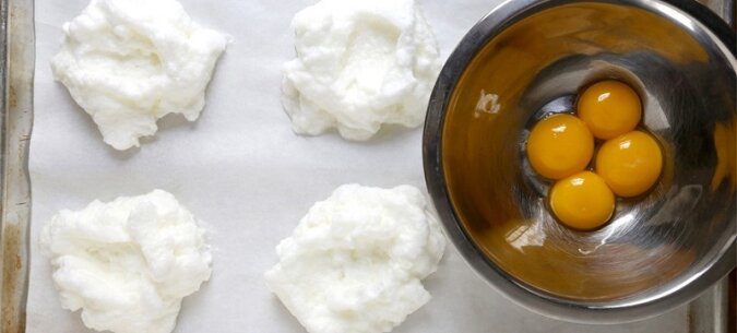 3. Na papier do pieczenia wyłóż ubite białko za pomocą łyżki i zrób małe zagłębienie na wierzchu białka.