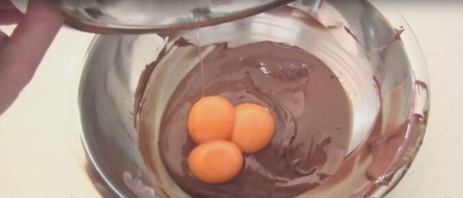 4. Następnie wymieszaj trzy żółtka z lekko schłodzoną czekoladą.