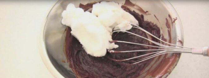 5. Teraz dodaj 1/3 ubitych wcześniej białek do mieszanki czekoladowej. Ubij masę trzepaczką.