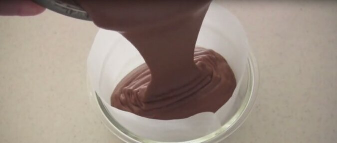 7. Dalej do dno naczynia do pieczenia wyłóż pergaminem. Naczynie musi być okrągłej formy. Wlej ciasto.
