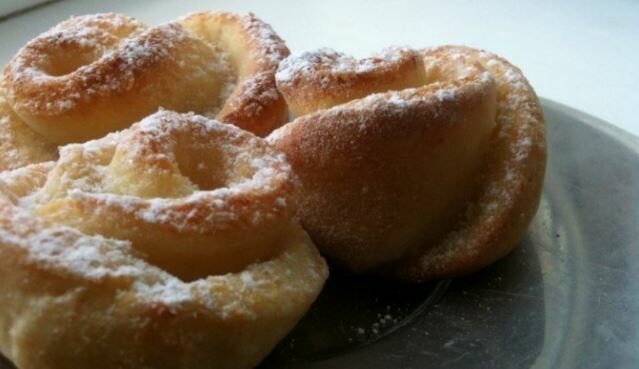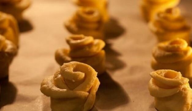 Układamy różyczki na blaszce, którą wyścielamy pergaminem. Możemy wysmarować różyczki żółtkiem i posypać wierzch cukrem. Pieczemy przez pół godziny przy temperaturze 120 stopni Celsjusza.