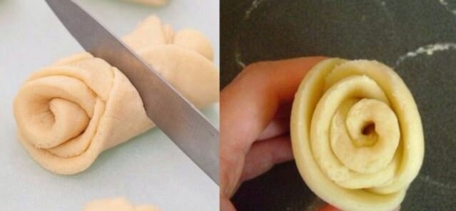 Następnie należy podsypać mąką, wałkować na placki o grubości 2-3 mm i powycinać krążki przy użyciu formy lub szklanki. Dalej musimy ułożyć 3 placki jeden na drugim, trochę przesunąć każdy i zwinąć w rolkę. Utworzony kształt trzeba pokroić na pół, wówczas otrzymamy dwie różyczki.