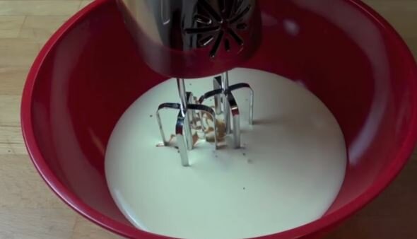 Po zmieszaniu całość wlej do śmietanki i ubij mikserem na sztywną masę.