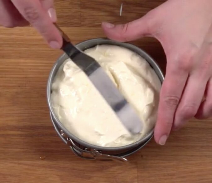 8. Równomiernie rozłóż masę kremową, wkładając ją do formy.