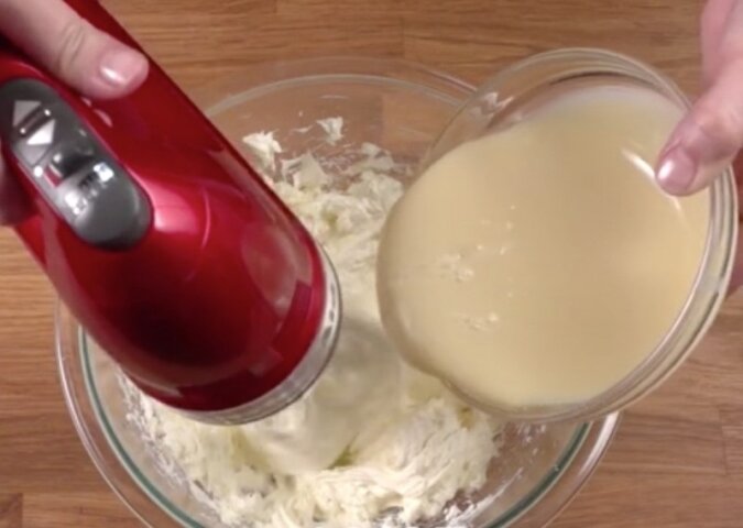 5. Dokładnie ubij ser śmietankowy. Kontynuując ubijanie, wlej mleko skondensowane.