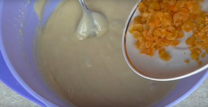 Skórkę mandarynki oraz suszone morele dodaj do ciasta. Ciasto delikatnie wymieszaj.