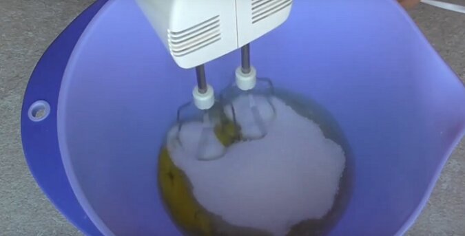 W wygodnym pojemniku trzeba ubić jajka z cukrem, aż powstanie biała pianka. Następnie dodać stopioną margarynę i kefir. Wszystko należy dobrze wymieszać.