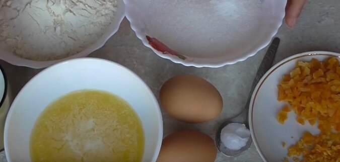 Margarynę należy stopić w łaźni parowej, a następnie ostudzić. Suszone morele pokroić na małe kostki, a później zetrzeć skórkę jednej mandarynki.