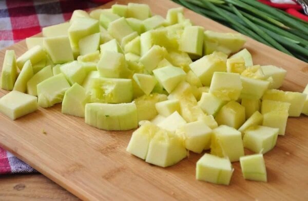Umyj młode cukinie i pokrój je w kostkę lub małe kawałki.