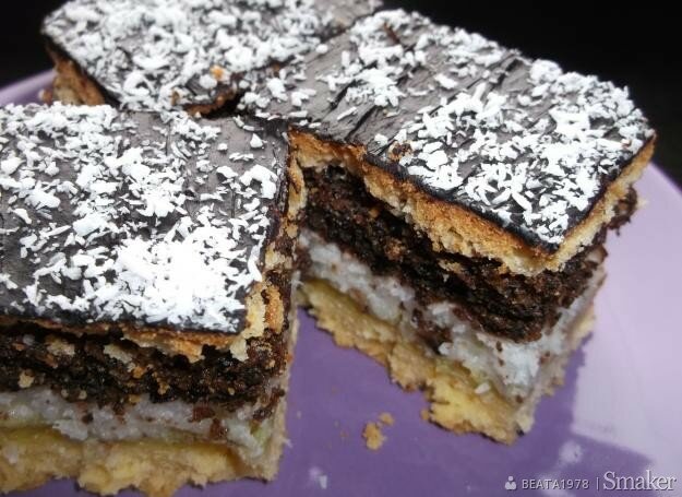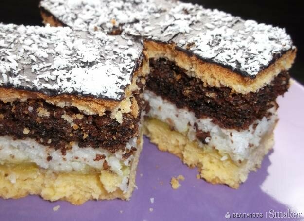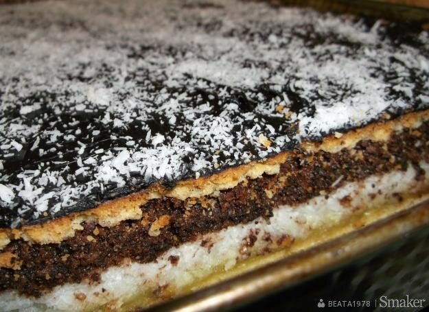8. Polanie ciasta polewą czekoladową i posypanie go wiórkami kokosowymi.