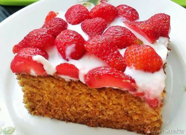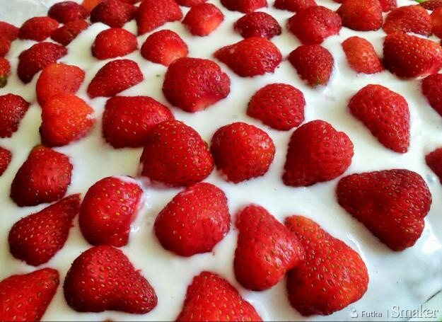5. Ułożenie na masie połówek truskawek oraz wstawienie ciasta do lodówki, by masa mogła stężeć.