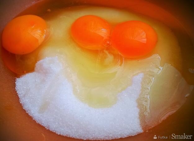 2. Ubcie jajek oraz cukru mikserem, dolanie oleju rzepakowego i ponowne zmiksowanie.