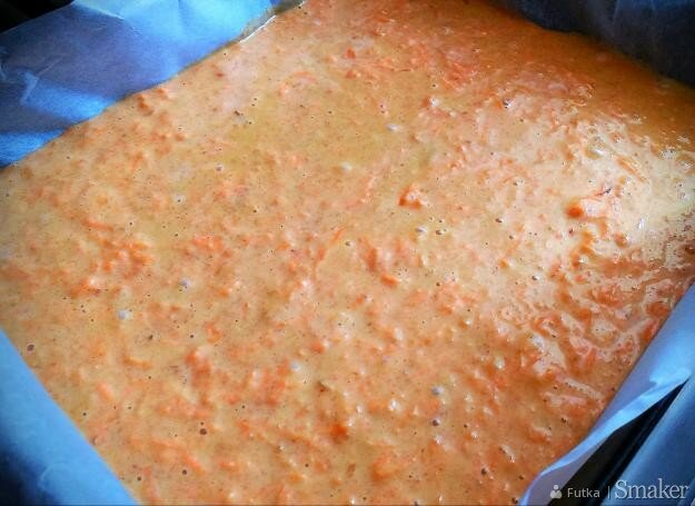 4. Dokłądne wymieszanie oraz wylanie ciasta na formę wyłożoną papierem do pieczenia.