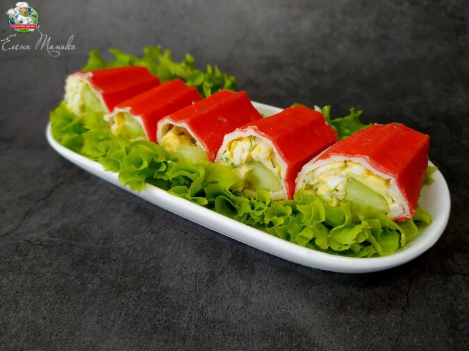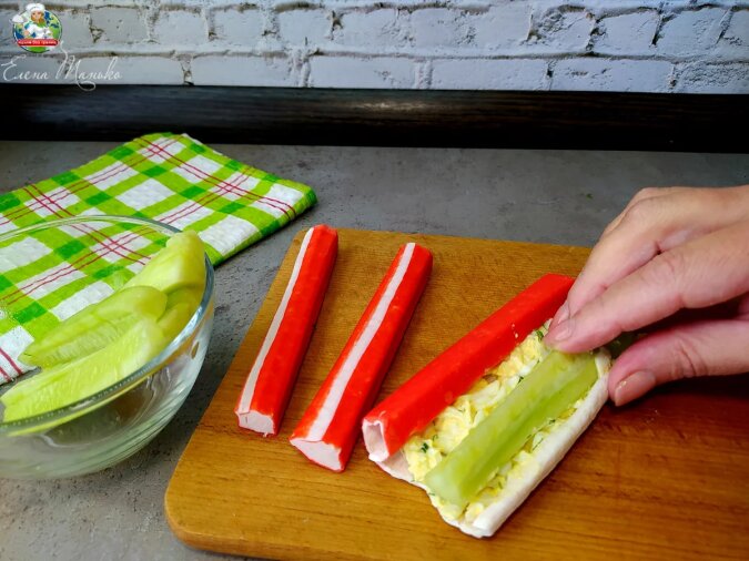 Rozwijam paluszek krabowy, rozkładam warstwę jajka i cienki plasterek ogórka (kroję każdą połowę ogórka na kolejne 2-3 części).