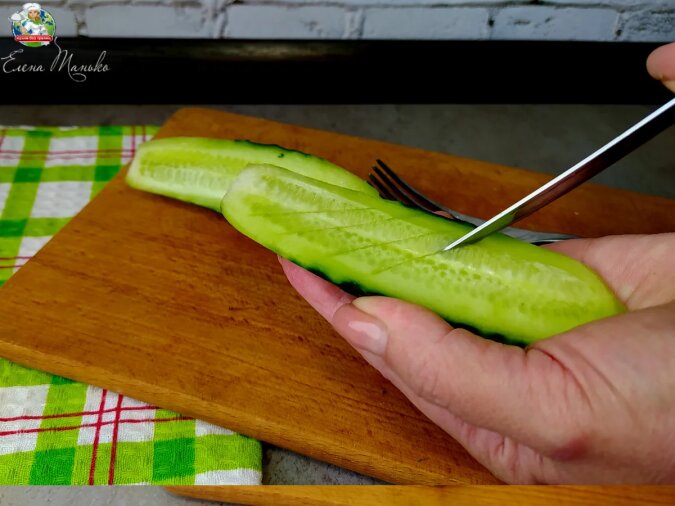Obieram ogórek, kroję wzdłuż na dwie części. Na każdej połowie wykonuję płytkie nacięcia w kształcie siateczki.