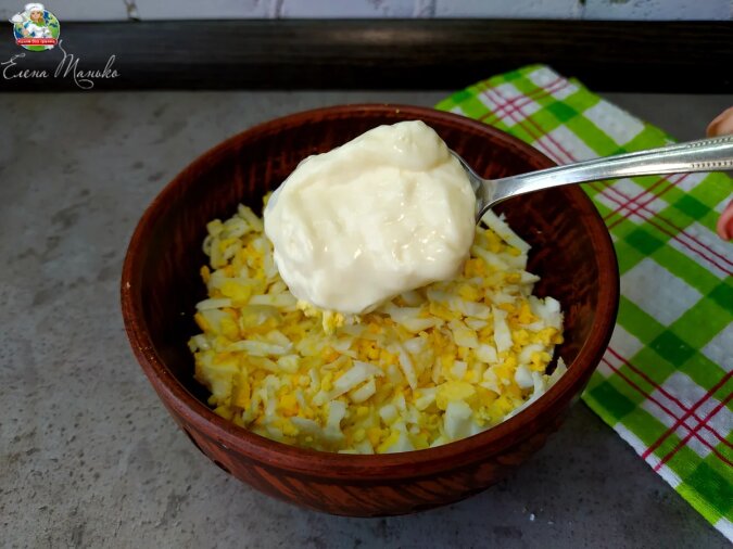 Do posiekanych na tarce gotowanych jajek dodaję majonez, drobno posiekany koperek i sól do smaku.