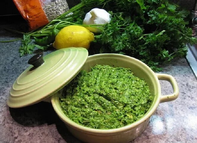 Następnie przepuszczam je przez maszynę do mięsa, dodaję kilka zmiażdżonych ząbków czosnku, trochę oleju roślinnego i trochę soku z cytryny. Dodaję to wszystko „na oko” i według własnego gustu. W razie potrzeby sos można dosolić.