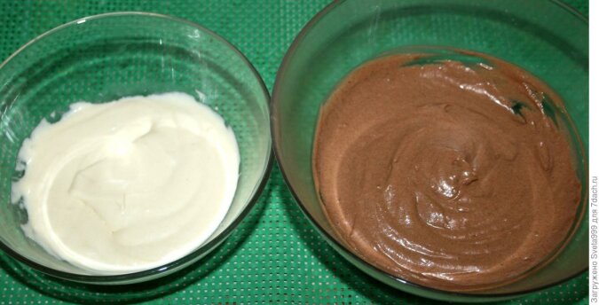 Na wierzchu jasnego ciasta wykładamy ciemne, a następnie delikatnie wyrównujemy.