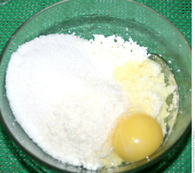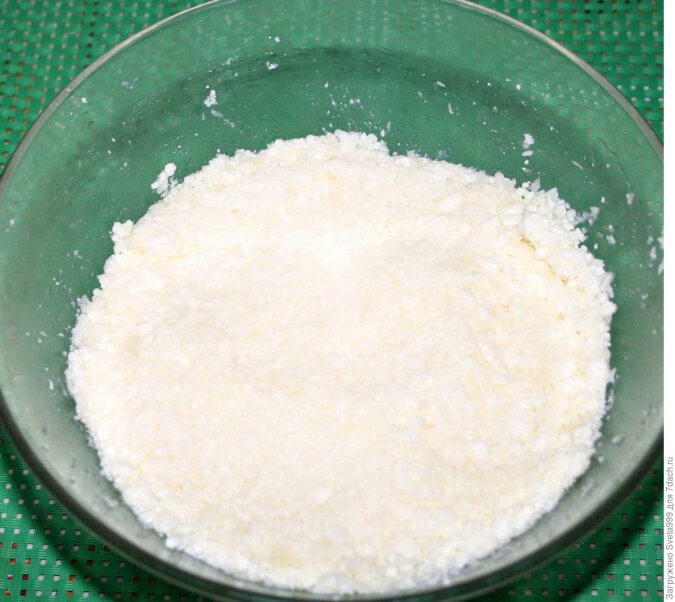 Najpierw przygotowujemy kokosowe kulki twarogowe. Do twarogu lub do masy twarogowej wbijamy 1 jajko, dodajemy 3 łyżki cukru i wsypujemy wiórki kokosowe.