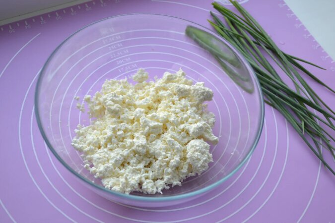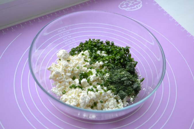 Dodam drobno pokrojoną cebulę i koper do twarogu. Używam zamrożonego koperku, bo akurat mi zostało.