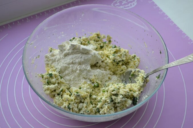 Do gotowej masy dodaję mąkę pszenną, ciasto należy dobrze wymieszać.