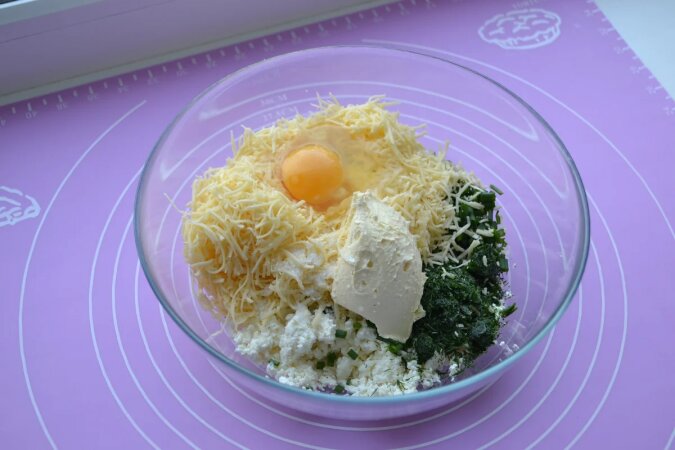 Teraz do wszystkich produktów dodaję jajko, łyżkę domowej roboty śmietany, można oczywiście też kupnej. A jeśli nie masz śmietany, można też dodać majonez. Sól do smaku, wszystko dokładnie mieszam. Czasami dodaję też granulowany suszony czosnek i mielony czarny pieprz.