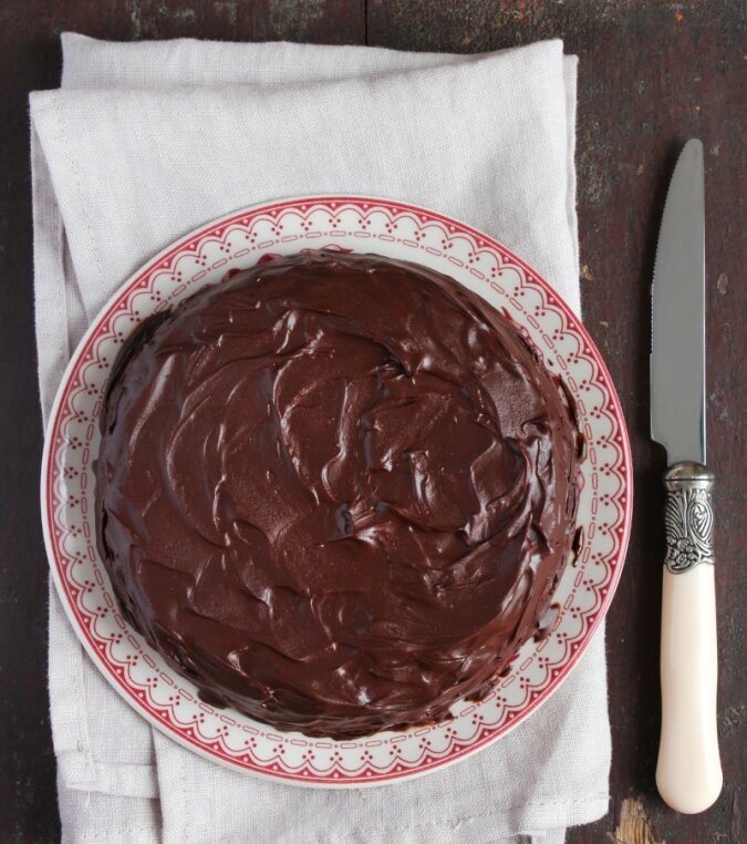 Następnie podgrzej śmietankę, dodając do niej czekoladę i dokładnie wymieszaj, aż stanie się gładka. Teraz polej ciasto ciepłym lukrem i rozprowadź po jego powierzchni.