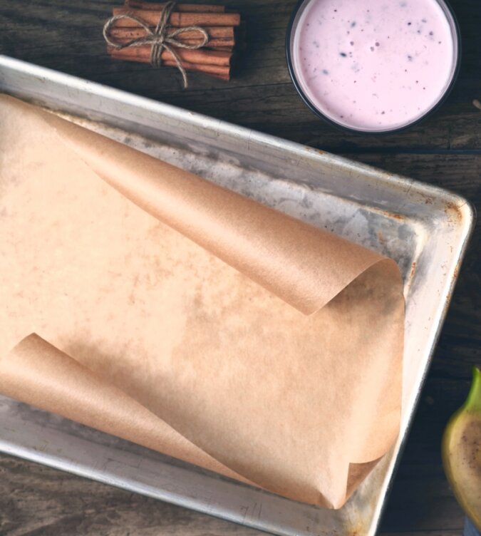 Następnie przykryj naczynie do pieczenia pergaminem i włóż do niego ciasto. Włóż ciasto do piekarnika i piecz przez pół godziny w temperaturze 180 stopni.