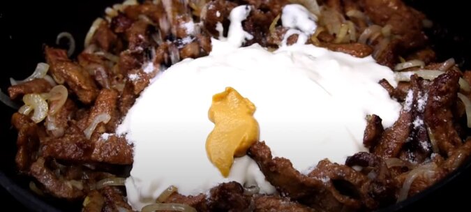 Teraz należy zmieszać wątróbkę i cebulę. Następnie dodać śmietanę, gorczycę, sól i czarny pieprz.