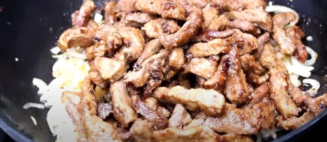 Cebulę podsmażamy na patelni i odkładamy na talerz. Na tę samą patelnię dodajemy oleju roślinnego i wykładamy wątrobę, smażymy, od czasu do czasu mieszając przez 10 minut.