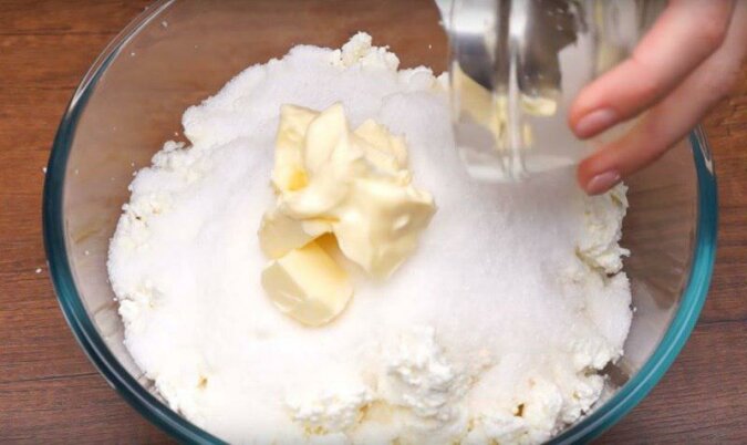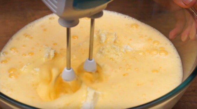 Osobno ubij jajka, z następnie do masy twarogowej dodaj mieszaninę z jaj. Potem ubij wszystko za pomocą miksera. Masa powinna być jednorodna.